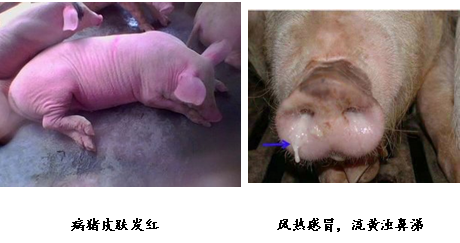 【临床症状】发热重,恶寒轻,体温升高至40~41.5℃。耳尖发热、眼红,身红,食欲不振,喜卧潮湿地方。鼻镜干燥,口干微红,舌苔薄黄,脉象浮数。粪便干硬,流黄浊涕,咽喉红肿疼痛,干咳。